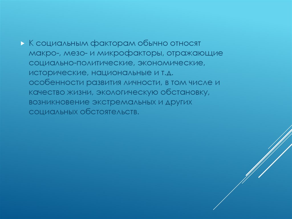 К социальным факторам обычно относятмакро-, мезо- и микрофакторы, отражающие