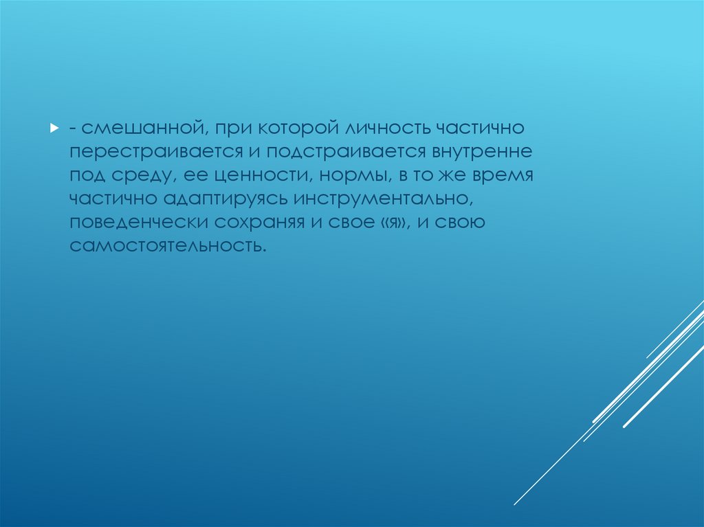 - смешанной, при которой личность частичноперестраивается и подстраивается внутренне
