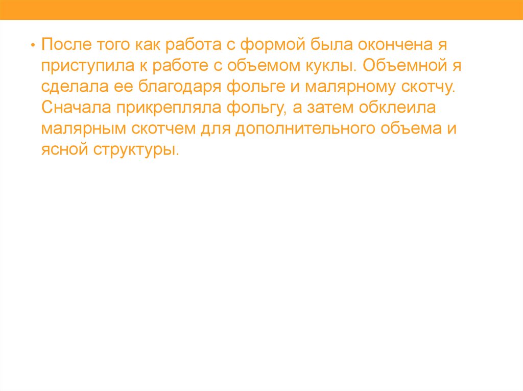 • После того как работа с формой была окончена яприступила к работе с объемом куклы. Объемной я