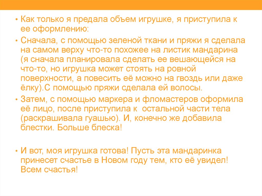 • И вот, моя игрушка готова! Пусть эта мандаринка