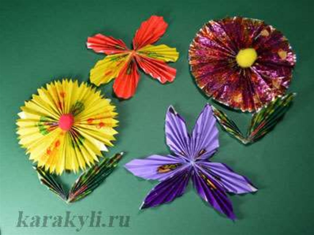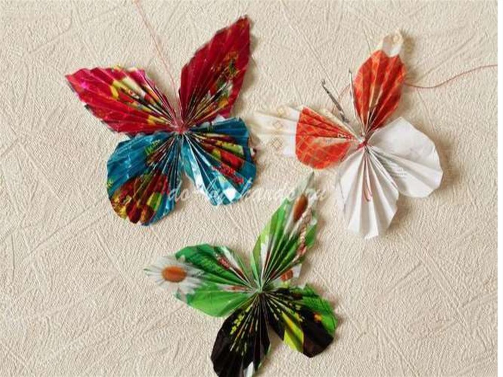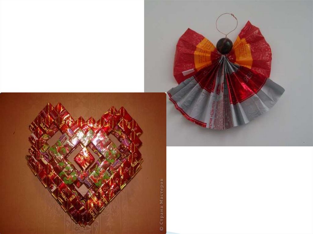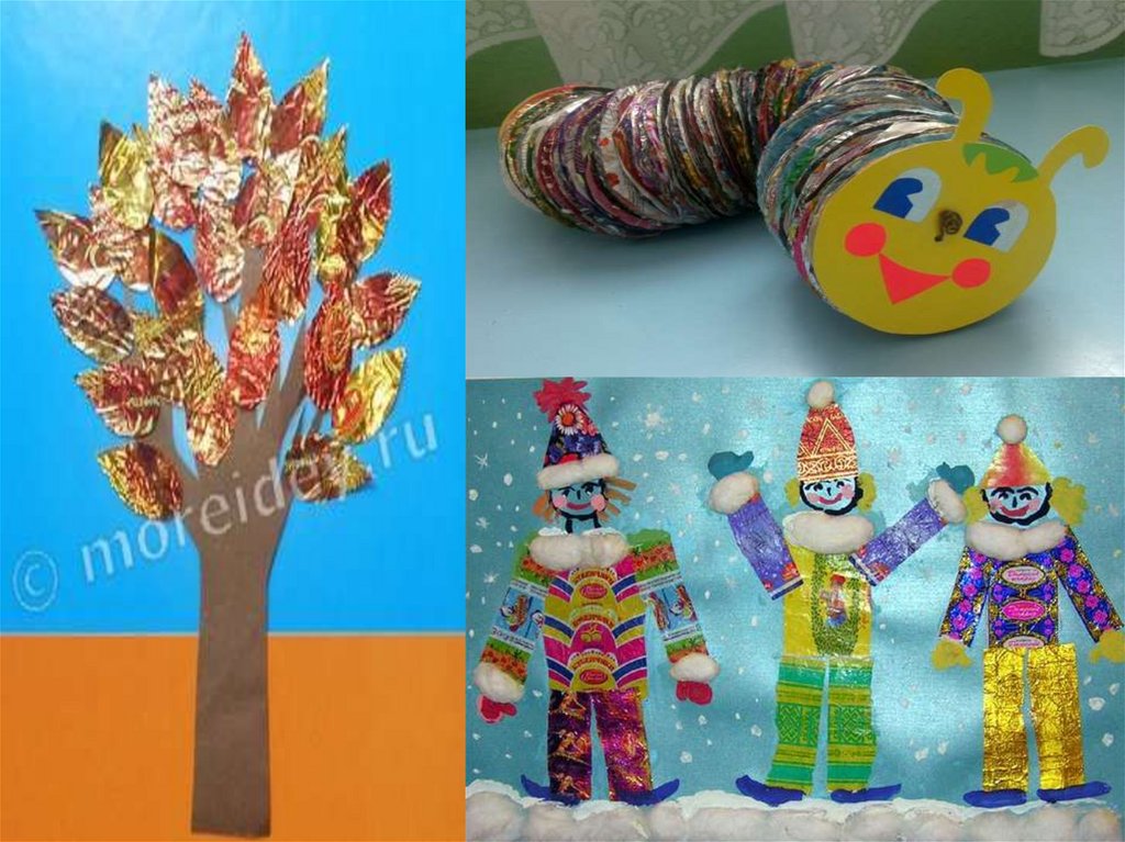 1. Учиться создавать композицию из бросовогоматериала (конфетные фантики).