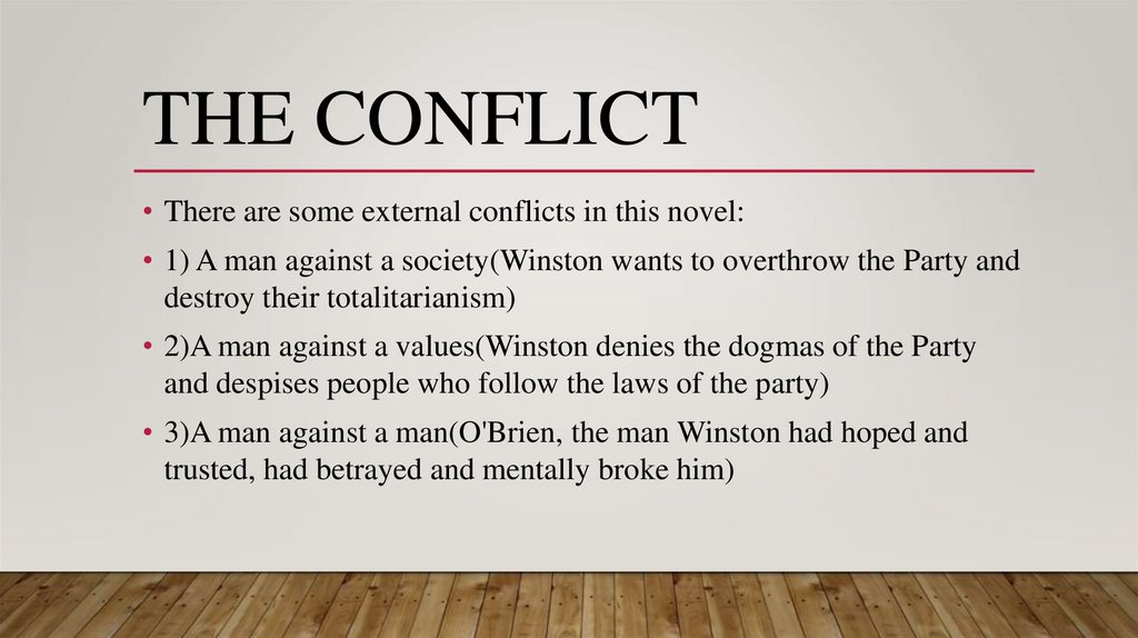 • 1) A man against a society(Winston wants to overthrow the Party and