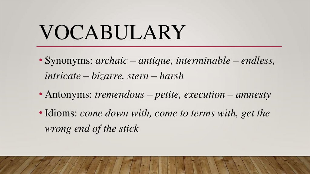 VOCABULARY• Synonyms: archaic – antique, interminable – endless,