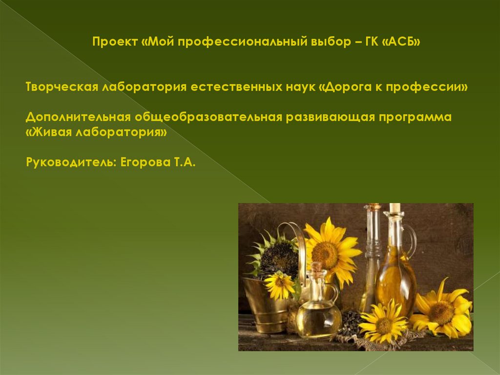 Проект «Мой профессиональный выбор – ГК «АСБ»Творческая лаборатория естественных наук «Дорога к профессии»
