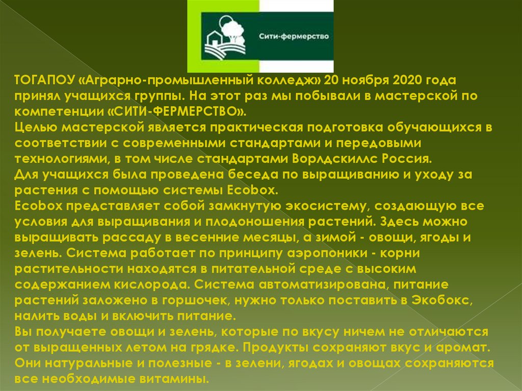 ТОГАПОУ «Аграрно-промышленный колледж» 20 ноября 2020 годапринял учащихся группы. На этот раз мы побывали в мастерской по