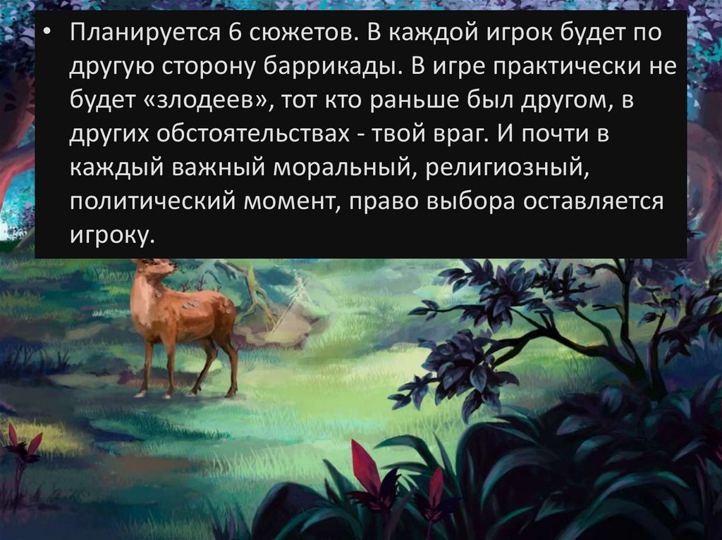 • Планируется 6 сюжетов. В каждой игрок будет подругую сторону баррикады. В игре практически не