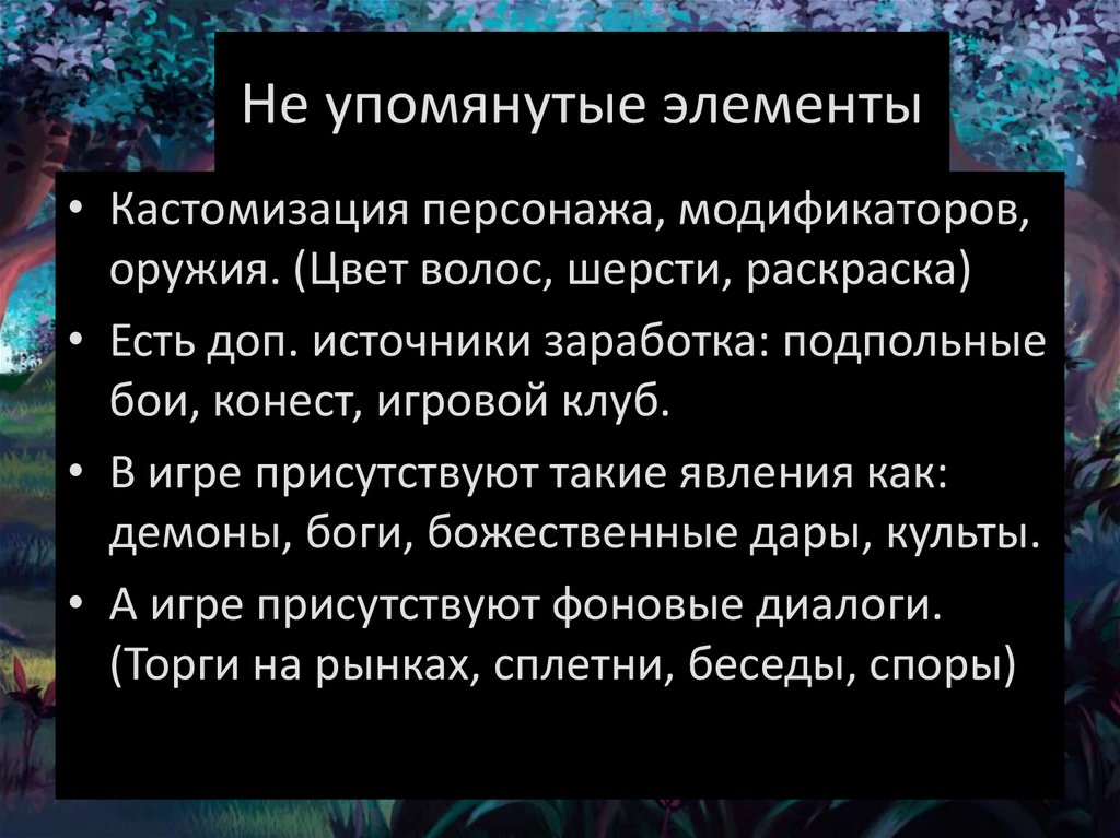 Не упомянутые элементы• Кастомизация персонажа, модификаторов,