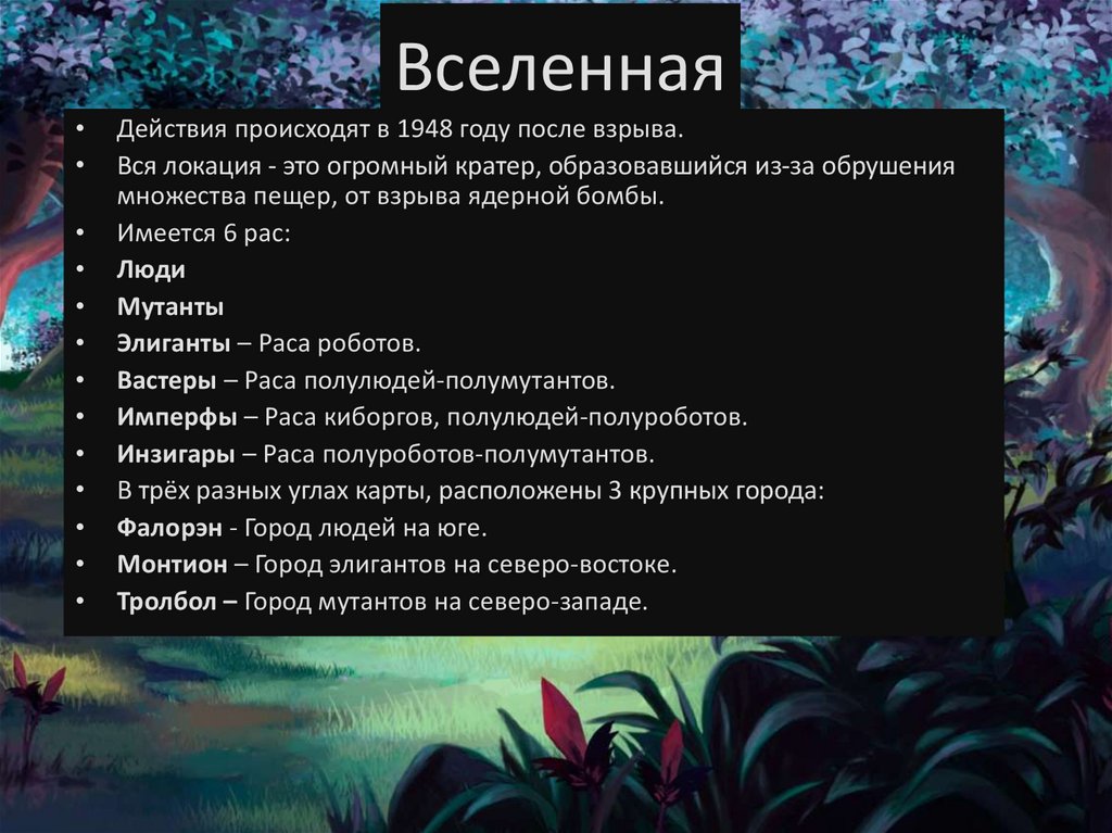 ВселеннаяДействия происходят в 1948 году после взрыва.