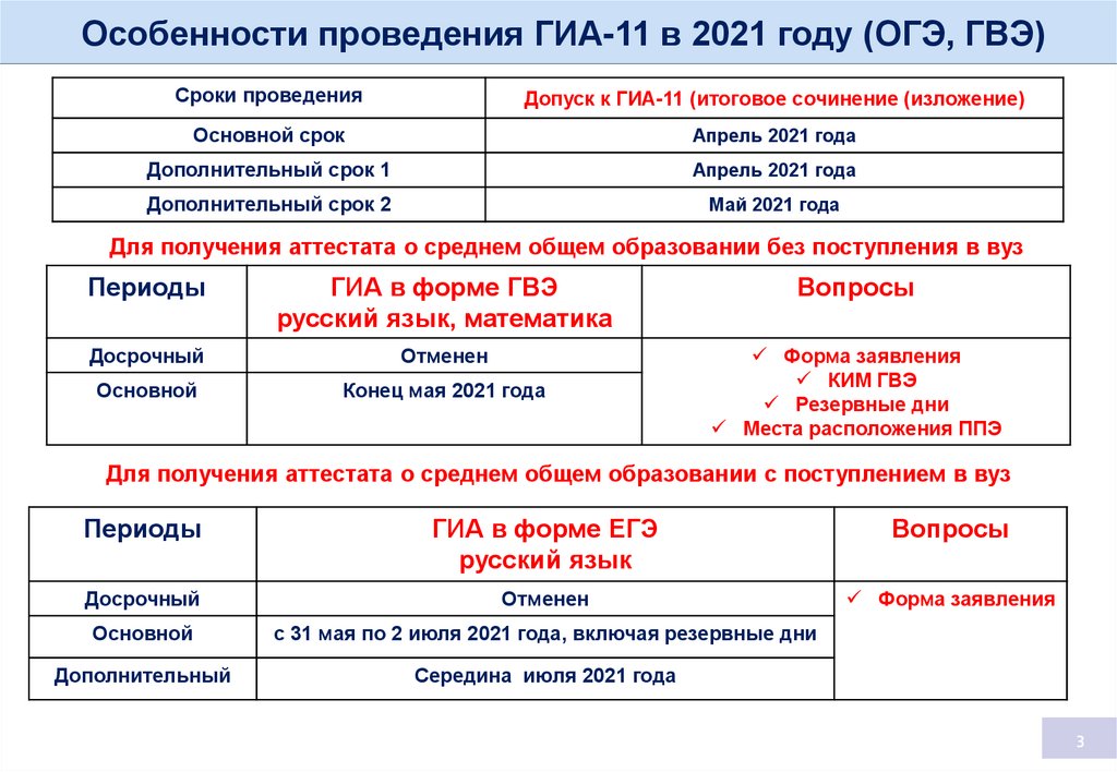 Особенности проведения ГИА-11 в 2021 году (ОГЭ, ГВЭ)Сроки проведения