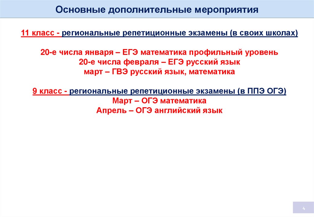 Основные дополнительные мероприятия11 класс - региональные репетиционные экзамены (в своих школах)
