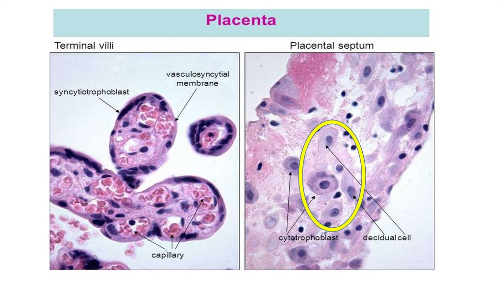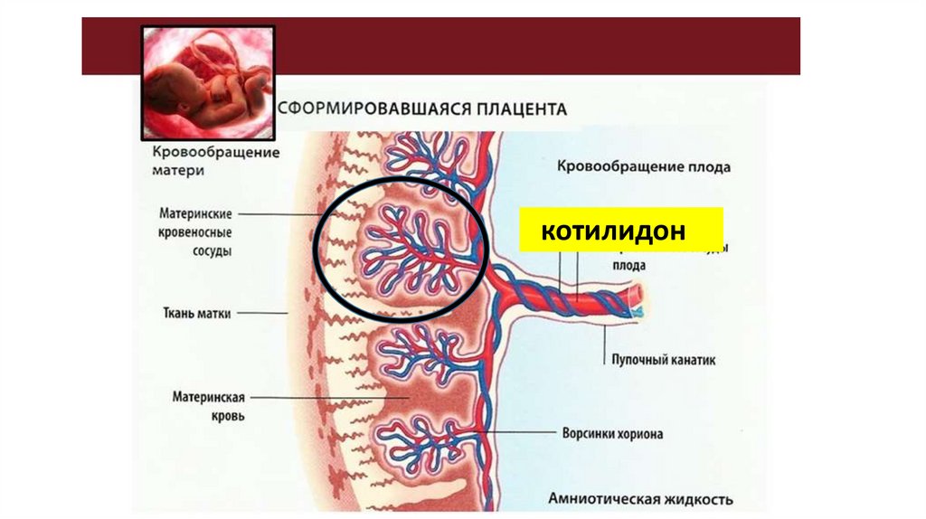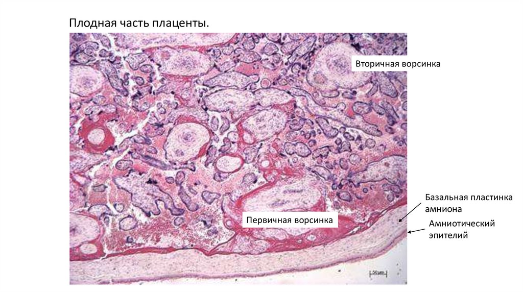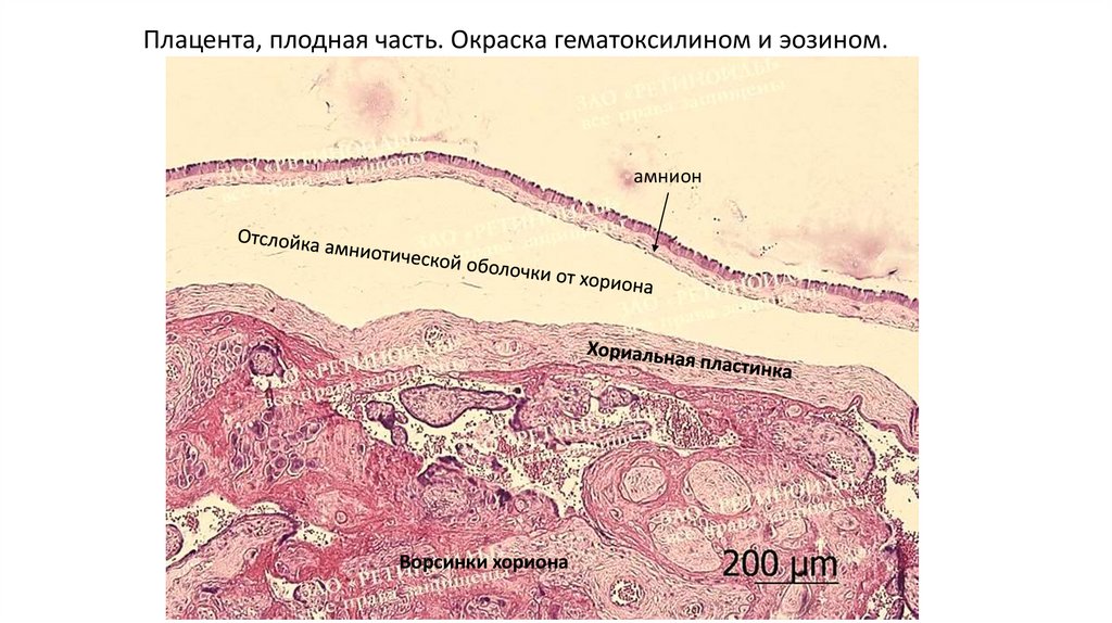 Плацента, плодная часть. Окраска гематоксилином и эозином.амнион