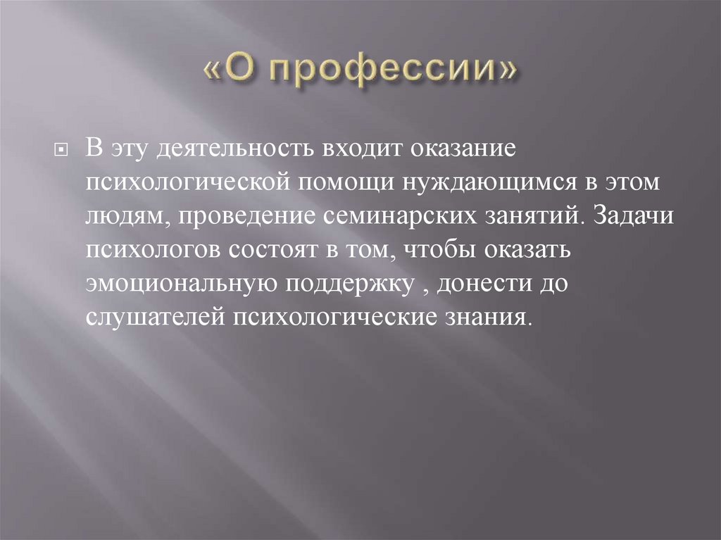 В эту деятельность входит оказаниепсихологической помощи нуждающимся в этом