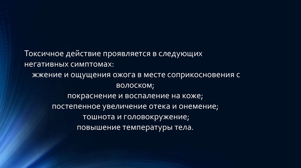 Токсичное действие проявляется в следующихнегативных симптомах: