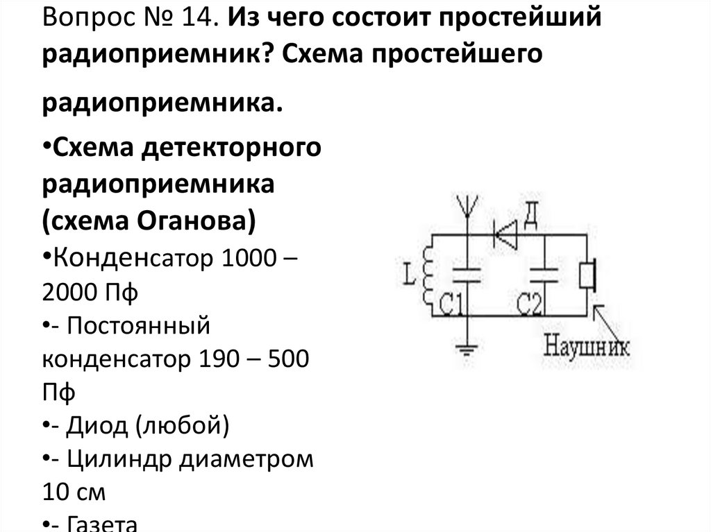 Вопрос № 14. Из чего состоит простейшийрадиоприемник? Схема простейшего