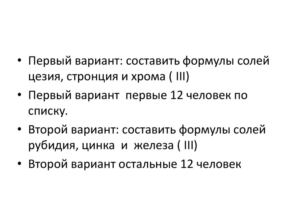 • Первый вариант: составить формулы солейцезия, стронция и хрома ( III)
