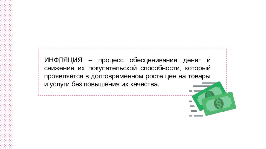 ИНФЛЯЦИЯ – процесс обесценивания денег иснижение их покупательской способности, который
