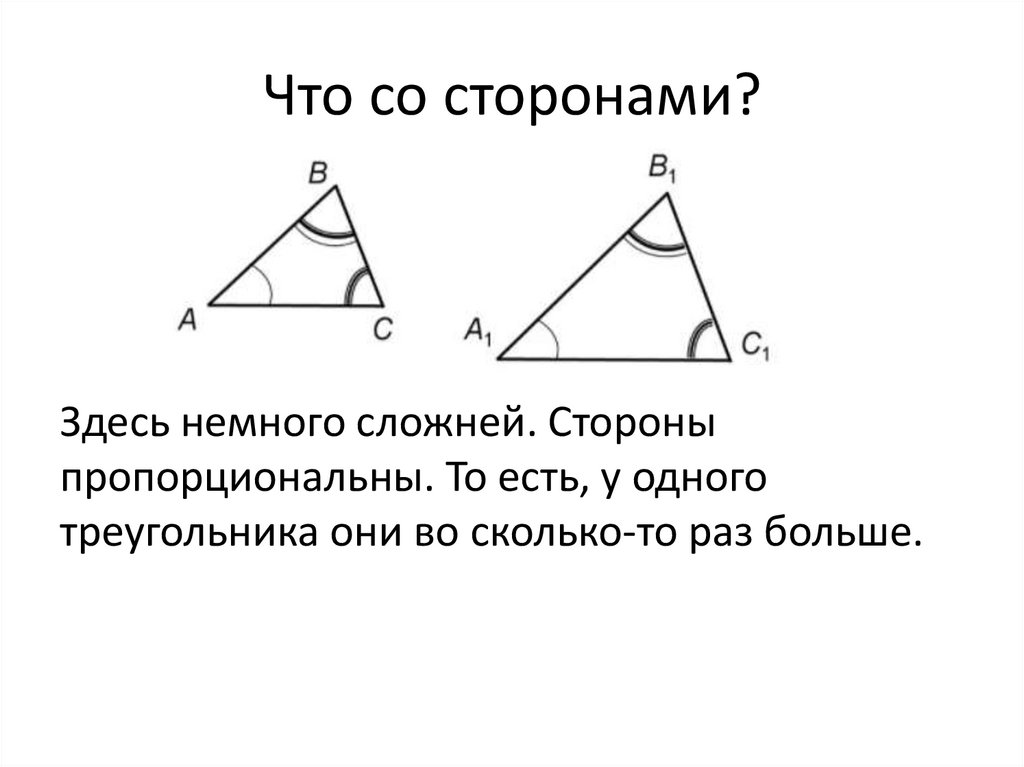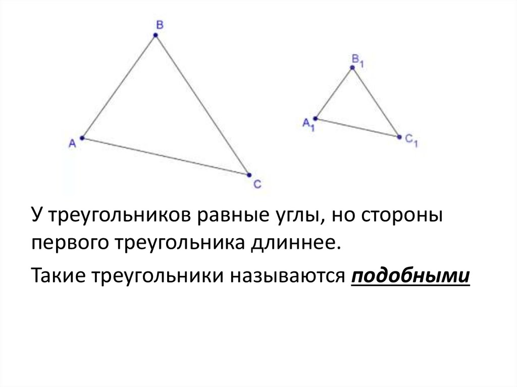 У треугольников равные углы, но стороныпервого треугольника длиннее.
