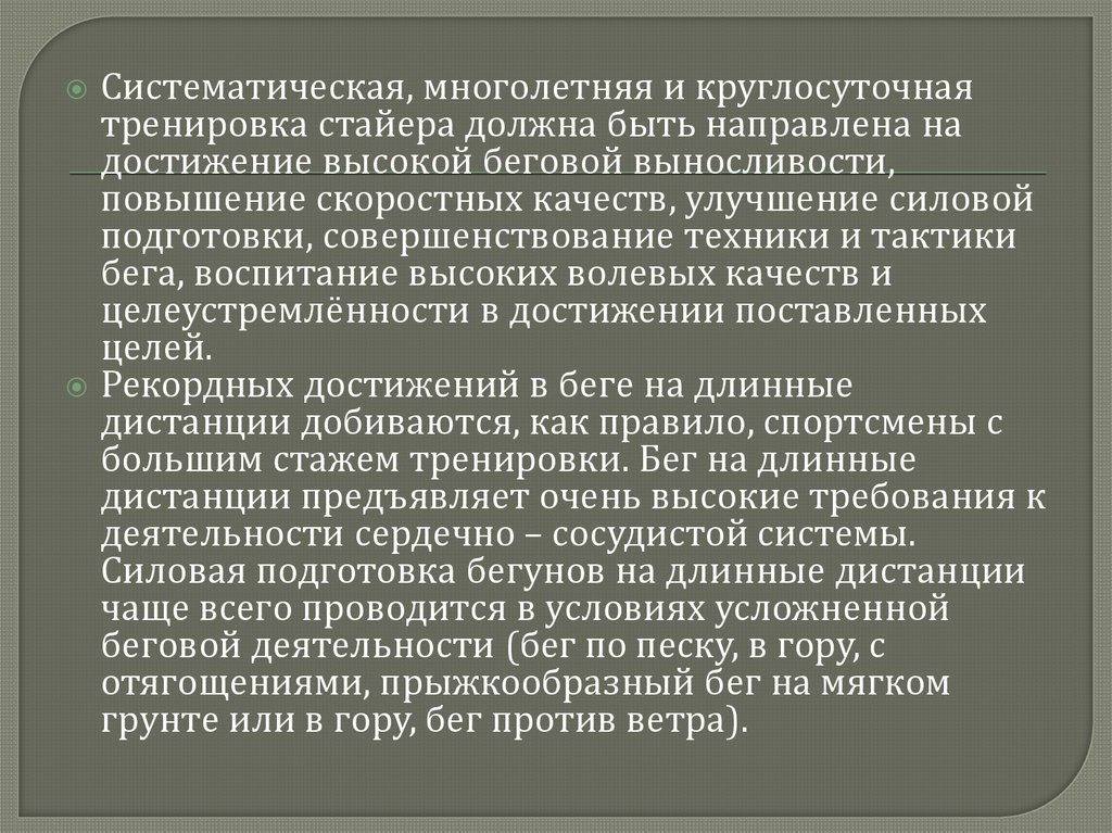 Систематическая, многолетняя и круглосуточнаятренировка стайера должна быть направлена на
