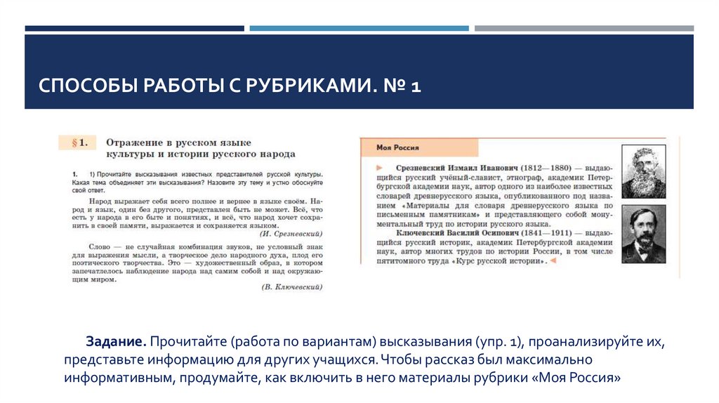 СПОСОБЫ РАБОТЫ С РУБРИКАМИ. № 1Задание. Прочитайте (работа по вариантам) высказывания (упр. 1), проанализируйте их,