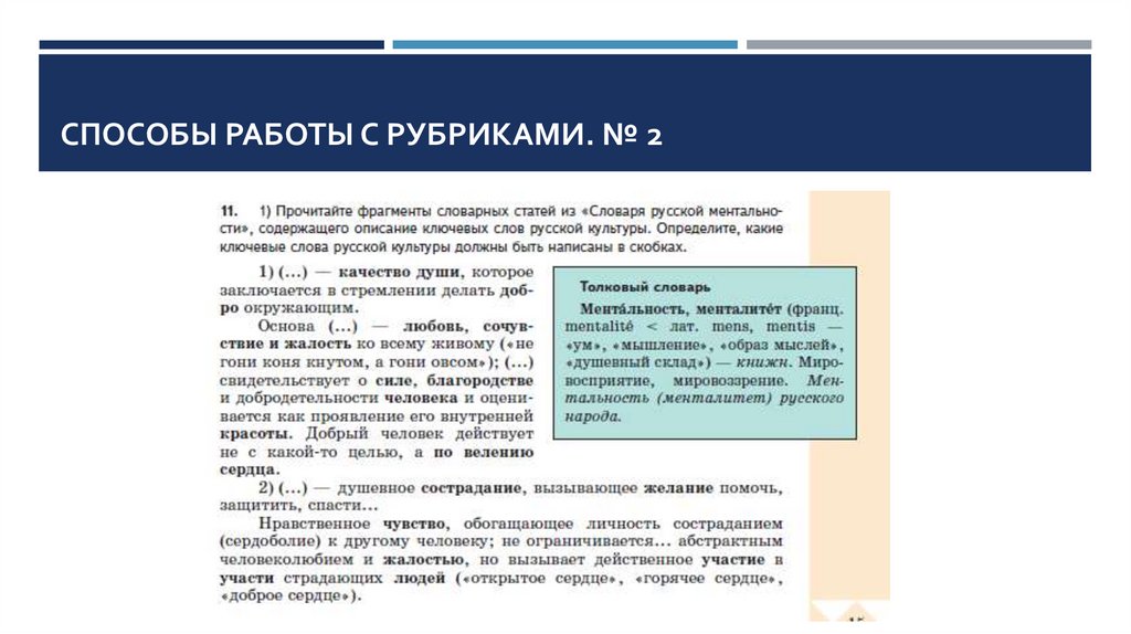 СПОСОБЫ РАБОТЫ С РУБРИКАМИ. № 2Подумайте, какие слова могут быть представлены в словаре русской ментальности?