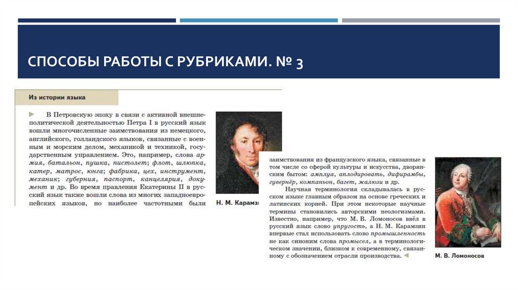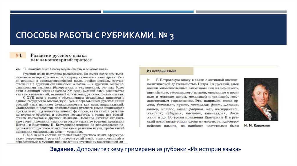 СПОСОБЫ РАБОТЫ С РУБРИКАМИ. № 3Задание. Дополните схему примерами из рубрики «Из истории языка»