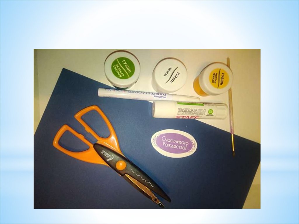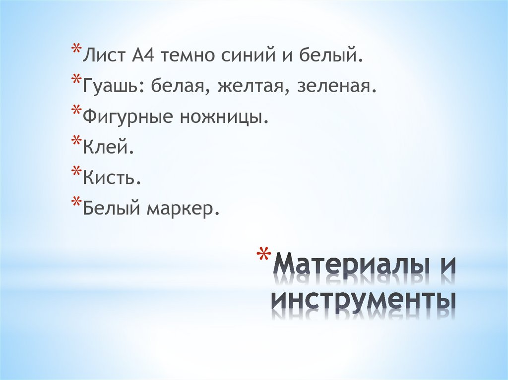 *Лист А4 темно синий и белый.*Гуашь: белая, желтая, зеленая.
