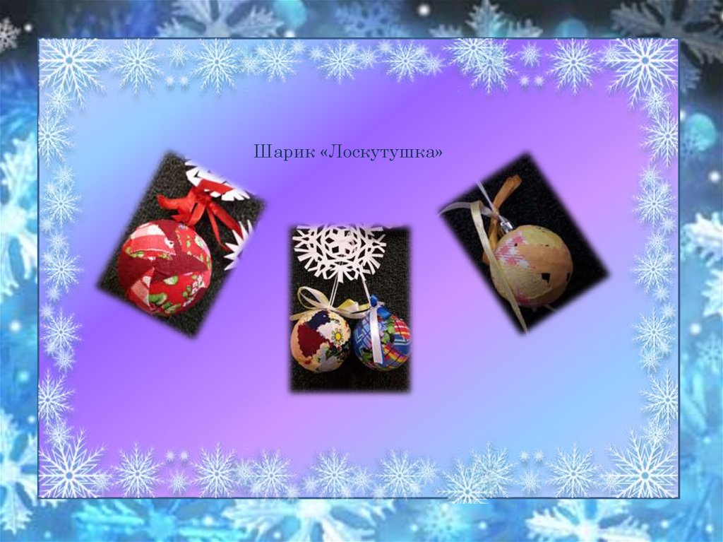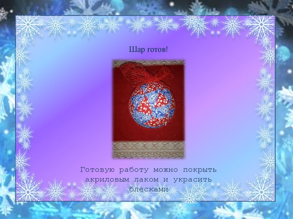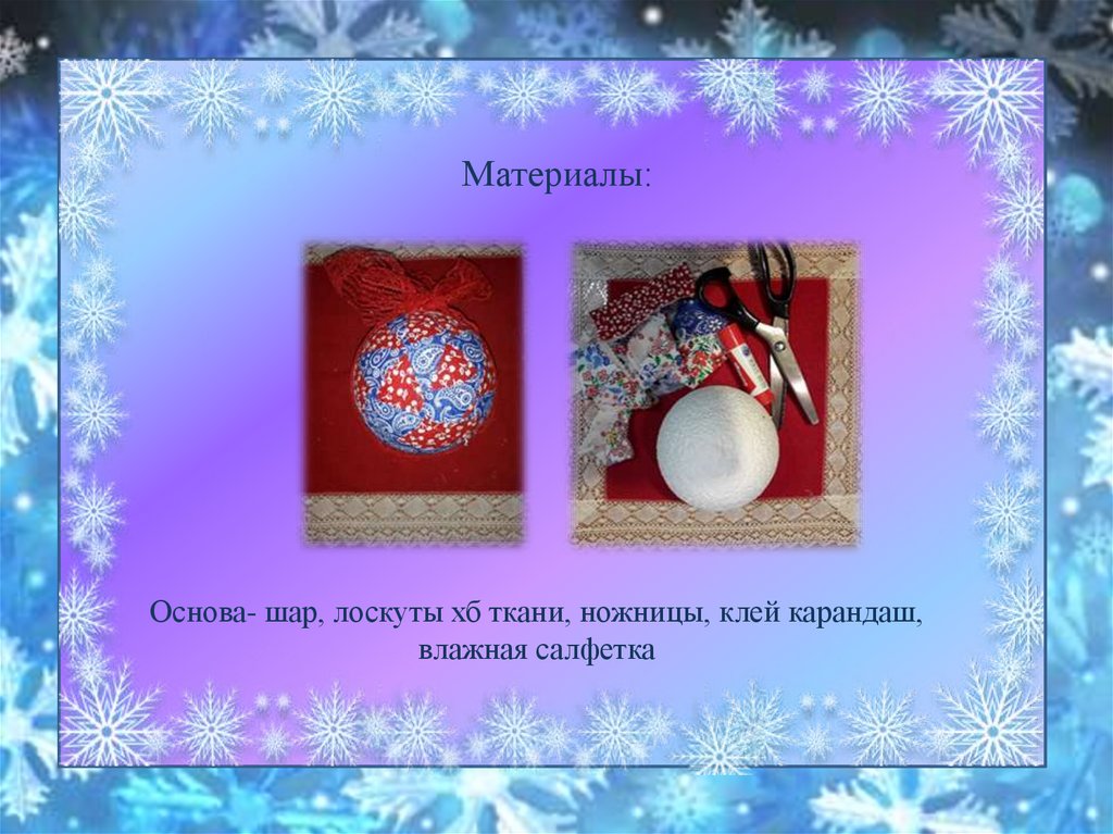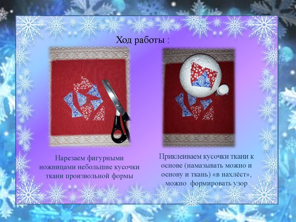 Материалы:Основа- шар, лоскуты хб ткани, ножницы, клей карандаш,