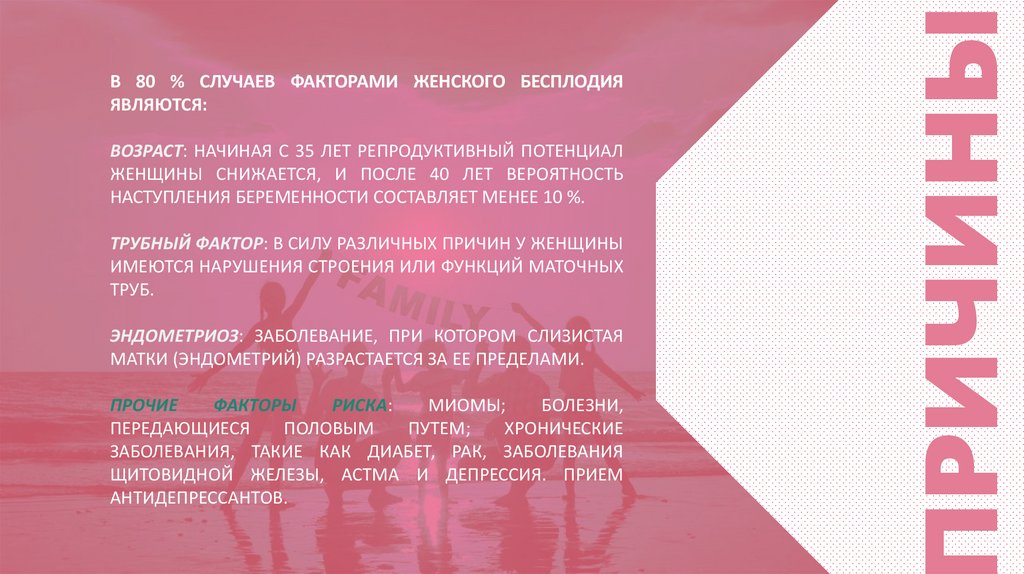 В 80 % СЛУЧАЕВ ФАКТОРАМИ ЖЕНСКОГО БЕСПЛОДИЯ