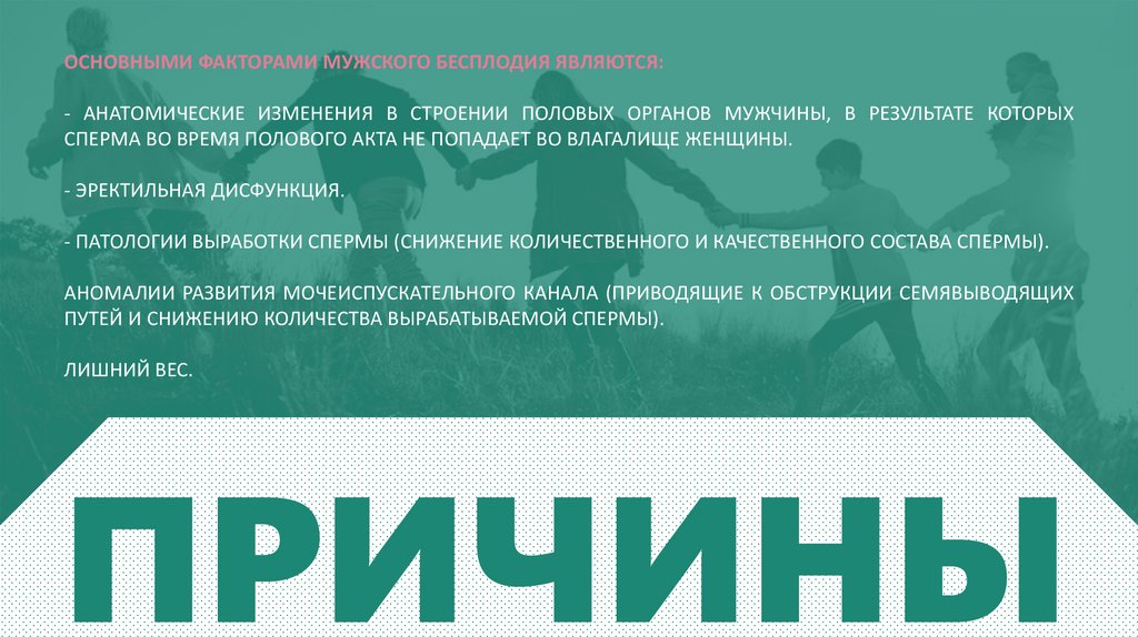 ОСНОВНЫМИ ФАКТОРАМИ МУЖСКОГО БЕСПЛОДИЯ ЯВЛЯЮТСЯ:- АНАТОМИЧЕСКИЕ ИЗМЕНЕНИЯ В СТРОЕНИИ ПОЛОВЫХ ОРГАНОВ МУЖЧИНЫ, В РЕЗУЛЬТАТЕ КОТОРЫХ
