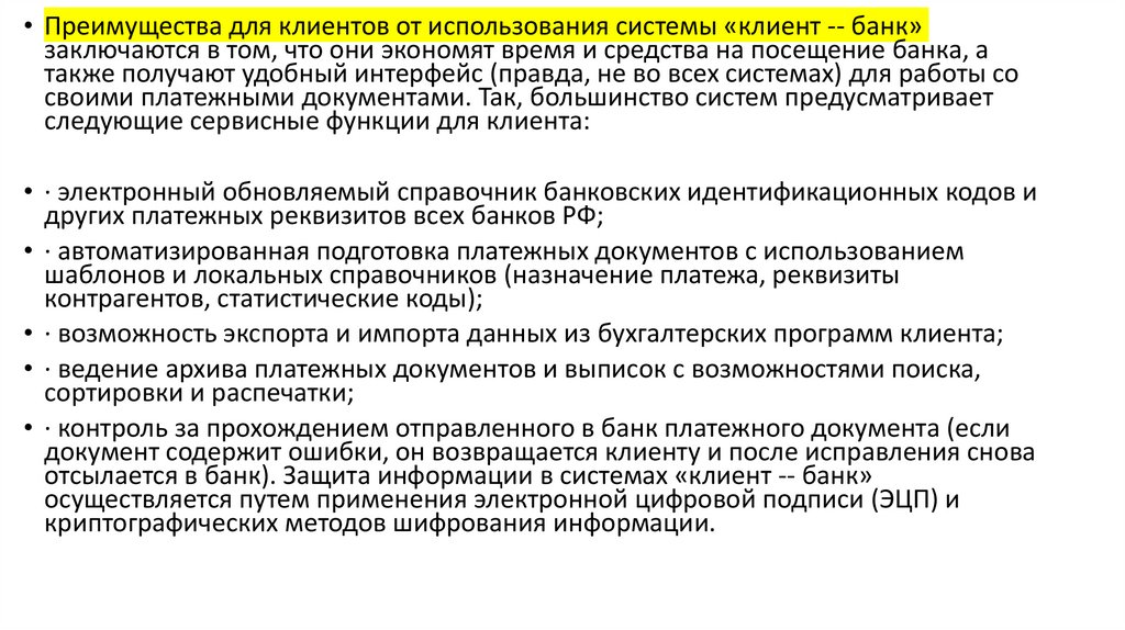 • Преимущества для клиентов от использования системы «клиент -- банк»заключаются в том, что они экономят время и средства на посещение банка, а
