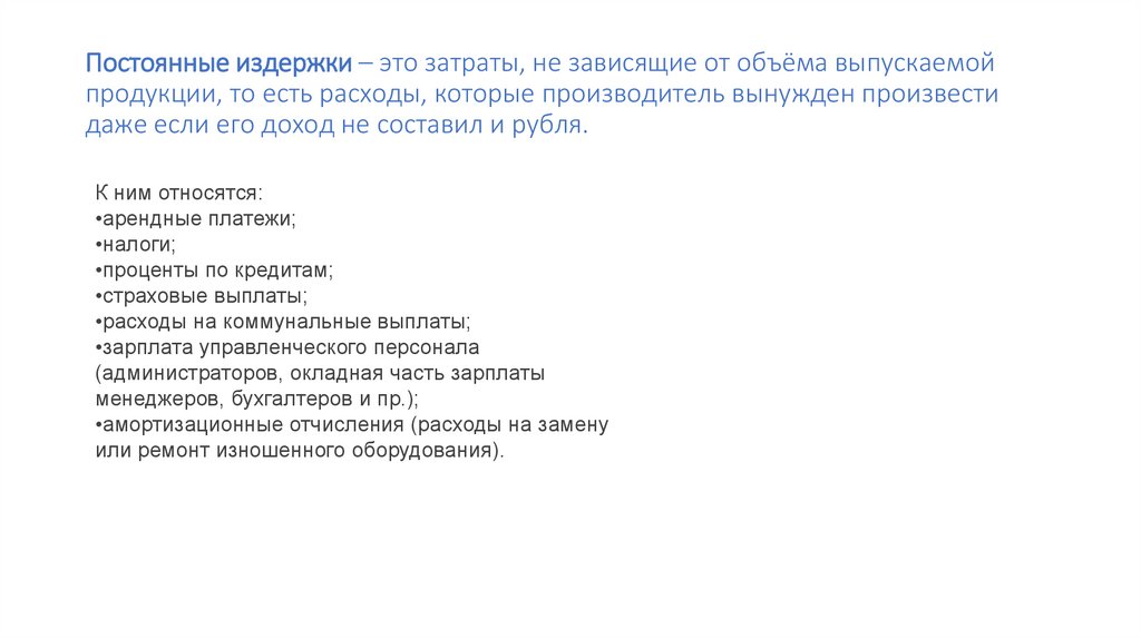 Постоянные издержки – это затраты, не зависящие от объёма выпускаемойпродукции, то есть расходы, которые производитель вынужден произвести