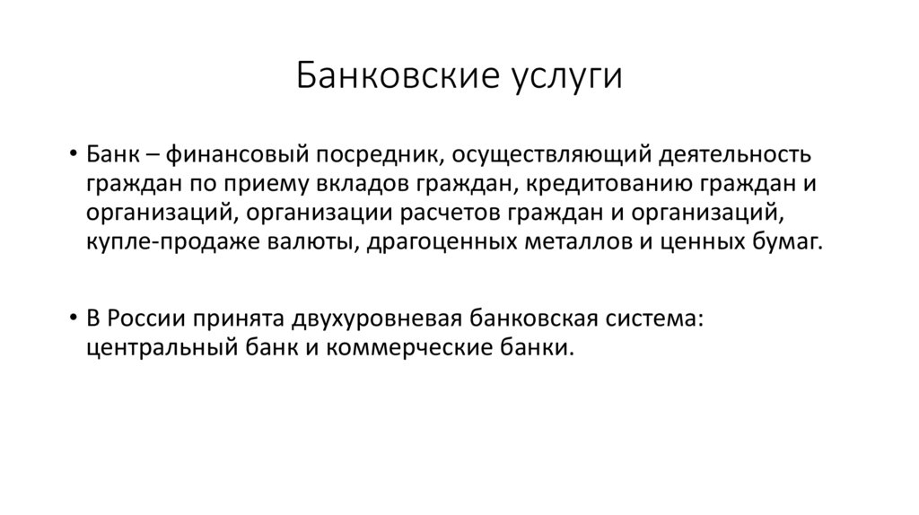 Банковские услуги• Банк – финансовый посредник, осуществляющий деятельность