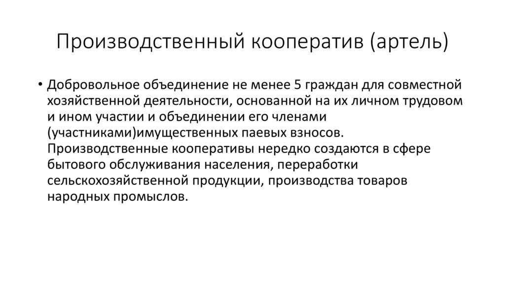 Производственный кооператив (артель)• Добровольное объединение не менее 5 граждан для совместной