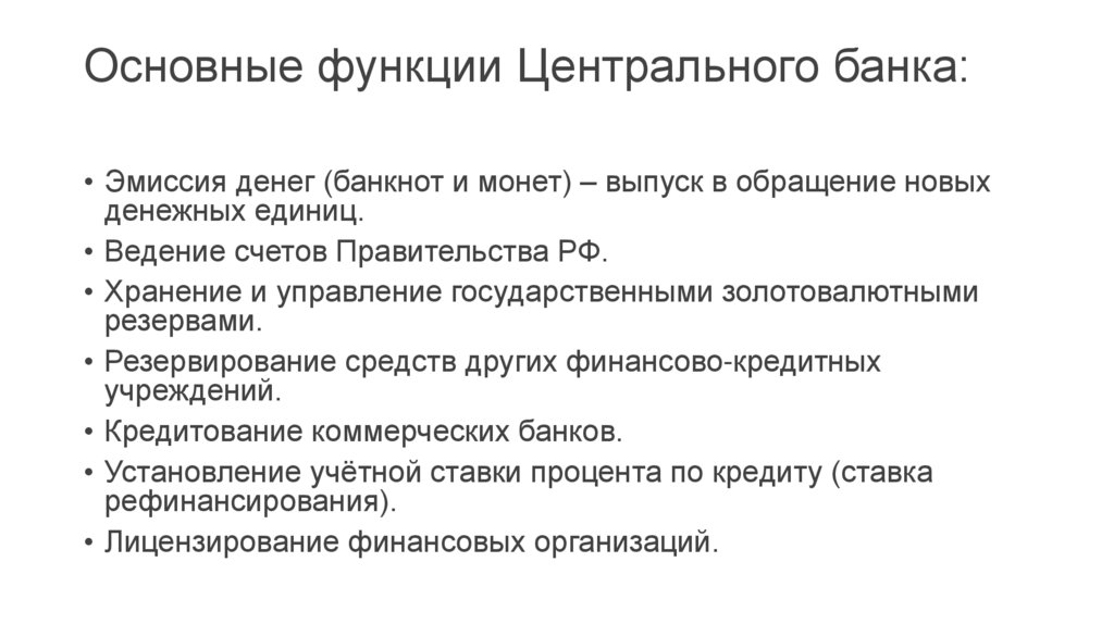 Основные функции Центрального банка:• Эмиссия денег (банкнот и монет) – выпуск в обращение новых