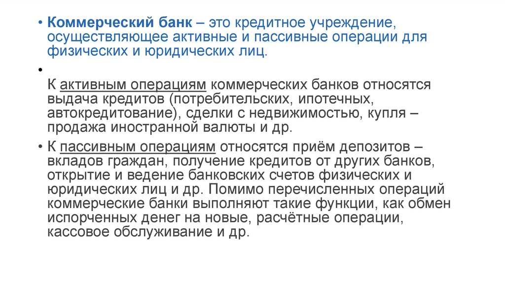 • Коммерческий банк – это кредитное учреждение,осуществляющее активные и пассивные операции для