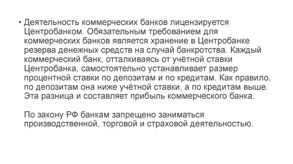 • Деятельность коммерческих банков лицензируетсяЦентробанком. Обязательным требованием для