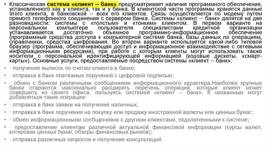 • Классическая система «клиент -- банк» предусматривает наличие программного обеспечения,установленного как у клиента, так и у банка. В клиентской части программы хранятся данные