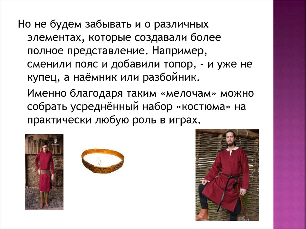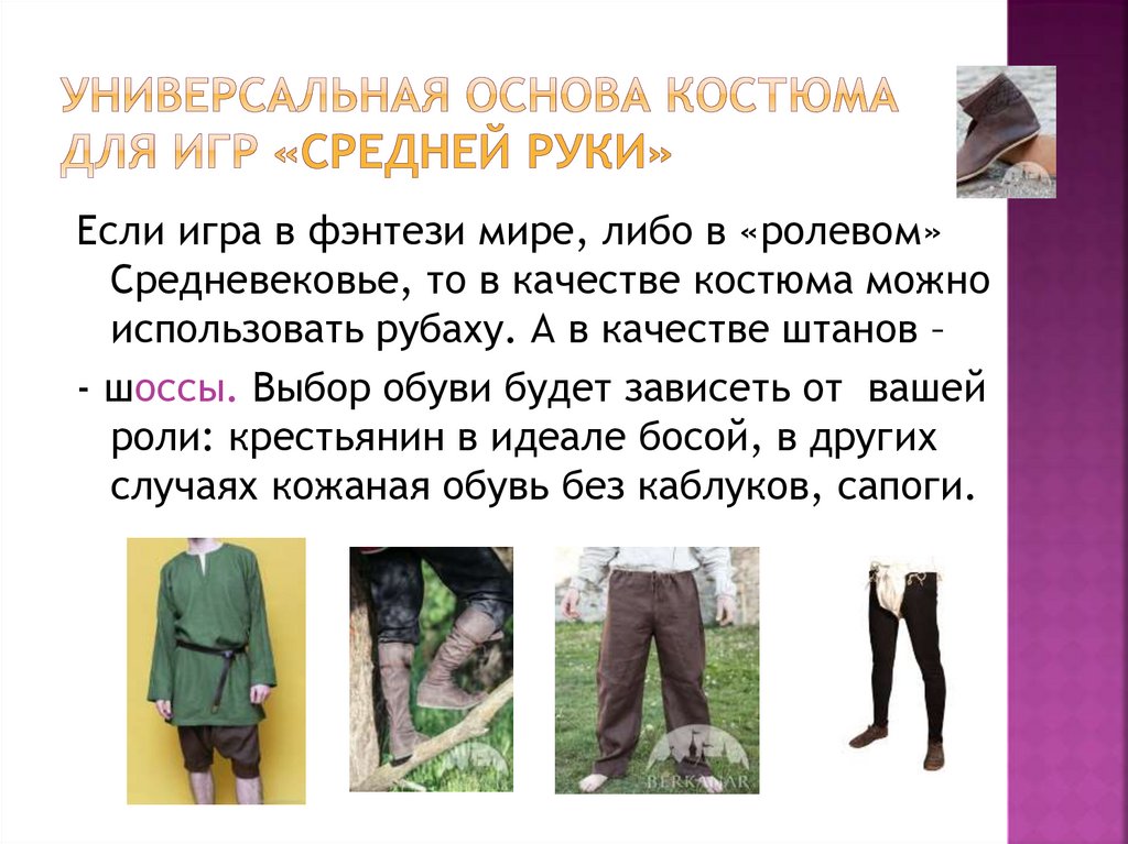 Если игра в фэнтези мире, либо в «ролевом»Средневековье, то в качестве костюма можно