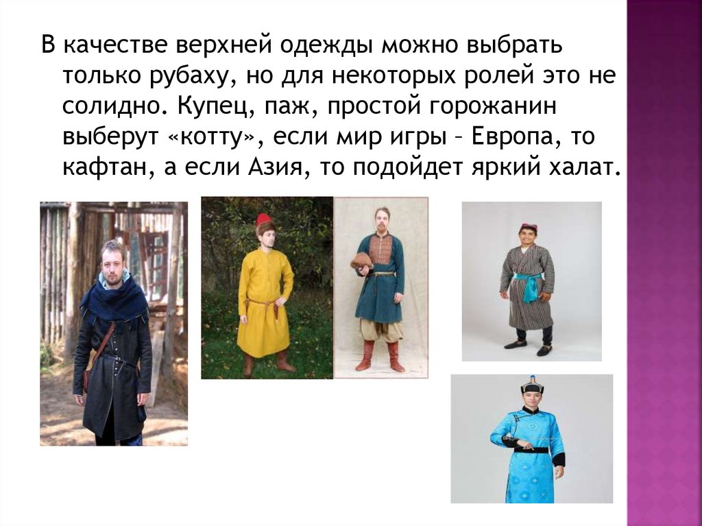 В качестве верхней одежды можно выбратьтолько рубаху, но для некоторых ролей это не