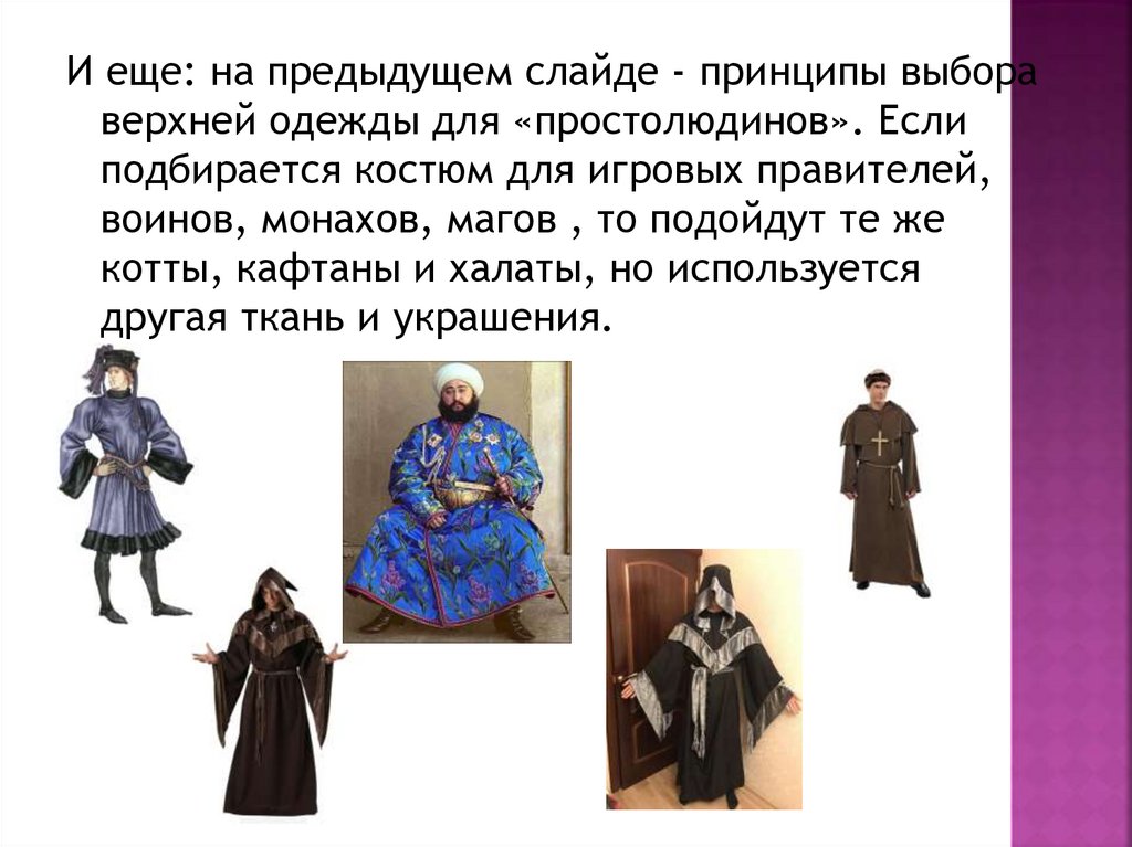 И еще: на предыдущем слайде - принципы выбораверхней одежды для «простолюдинов». Если