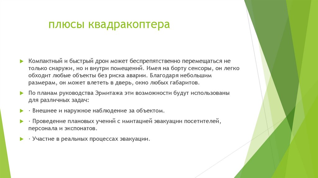 плюсы квадракоптераКомпактный и быстрый дрон может беспрепятственно перемещаться не