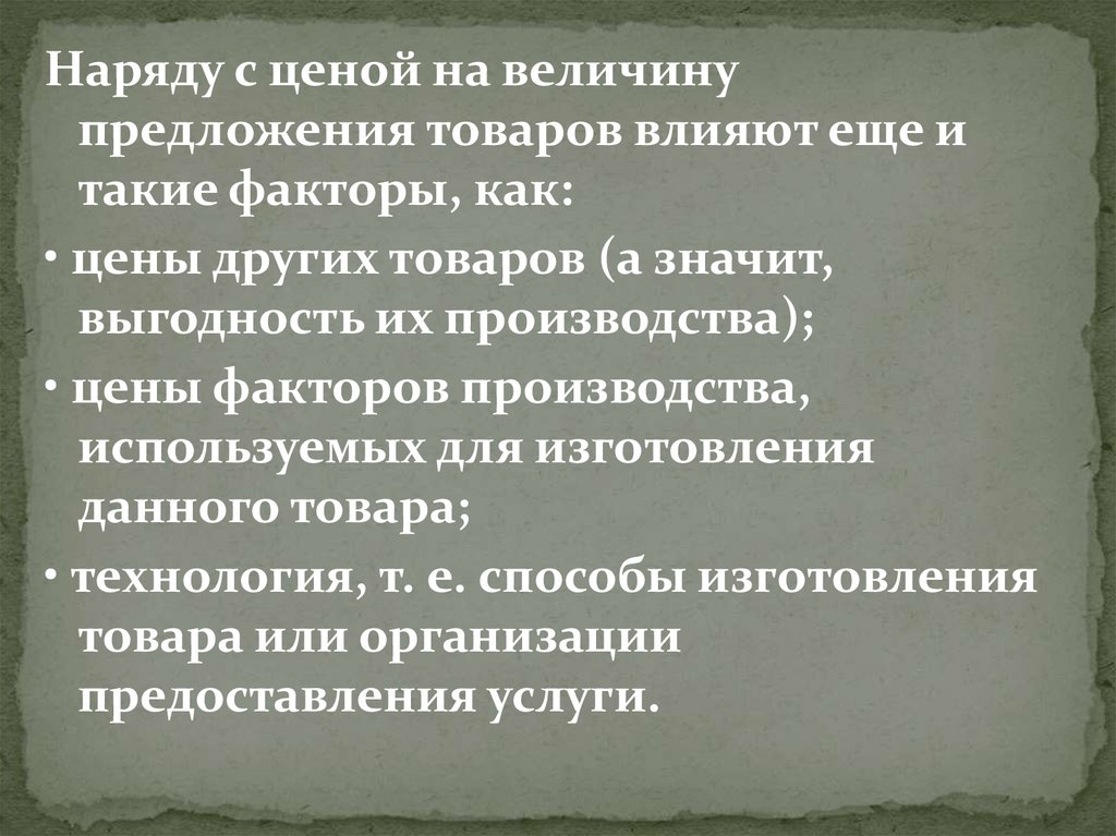 Наряду с ценой на величинупредложения товаров влияют еще и