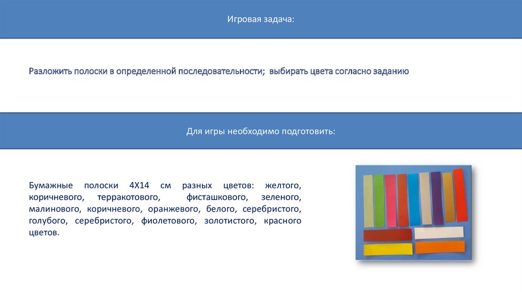 Игровая задача:Разложить полоски в определенной последовательности; выбирать цвета согласно заданию