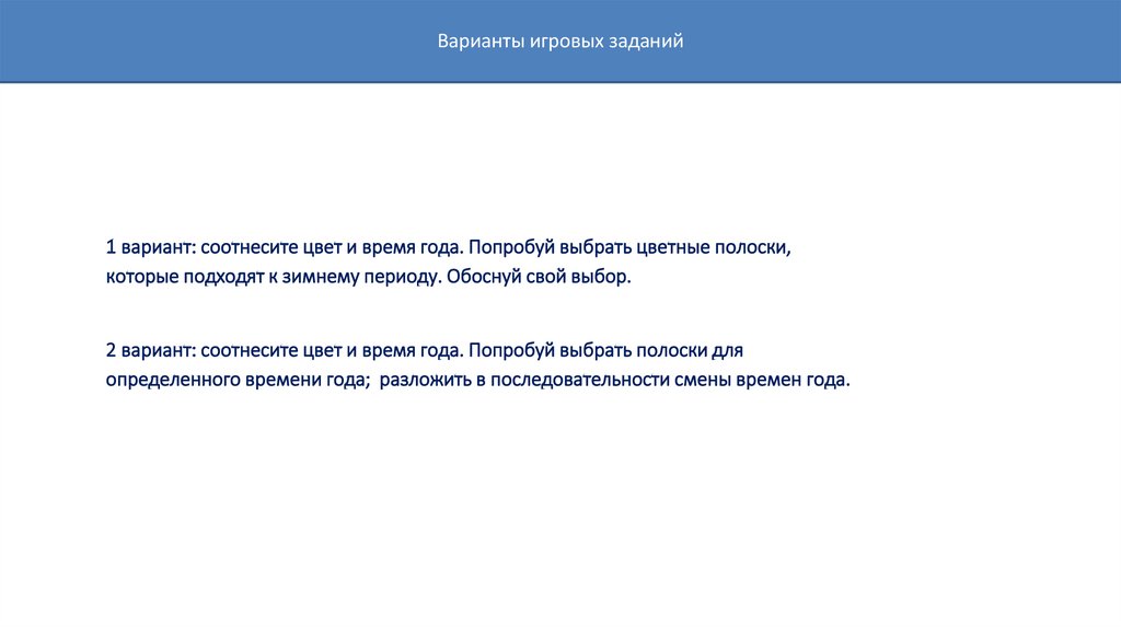Варианты игровых заданий1 вариант: соотнесите цвет и время года. Попробуй выбрать цветные полоски,