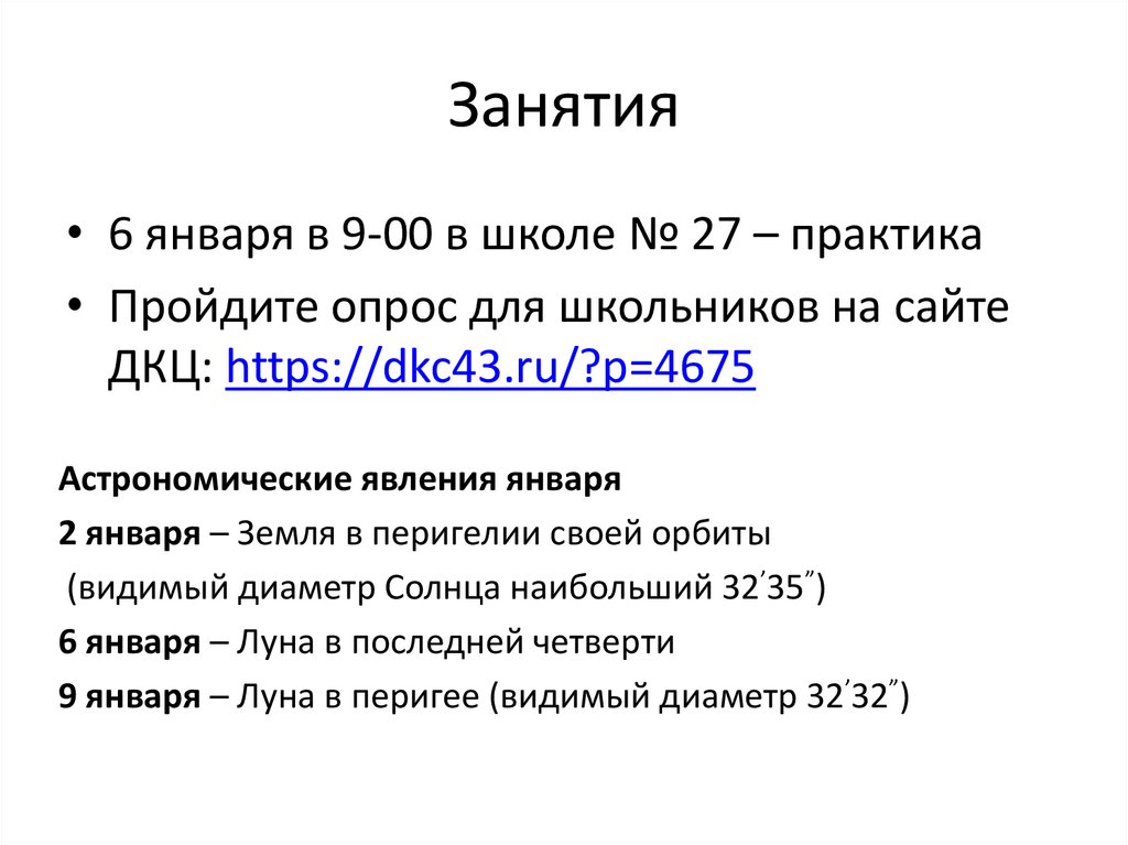 Занятия• 6 января в 9-00 в школе № 27 – практика