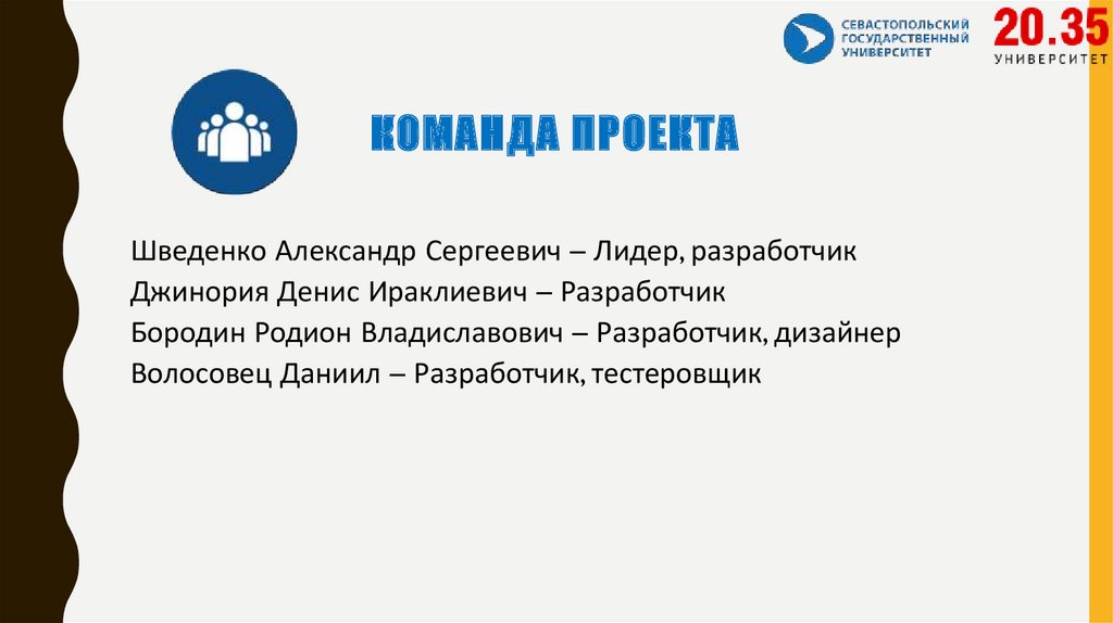 КОМАНДА ПРОЕКТАШведенко Александр Сергеевич – Лидер, разработчик