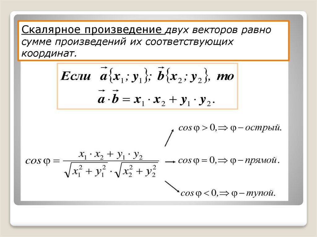 Скалярное произведение двух векторов равносумме произведений их соответствующих