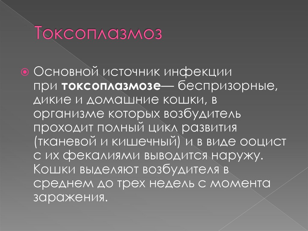 Основной источник инфекциипри токсоплазмозе— беспризорные,
