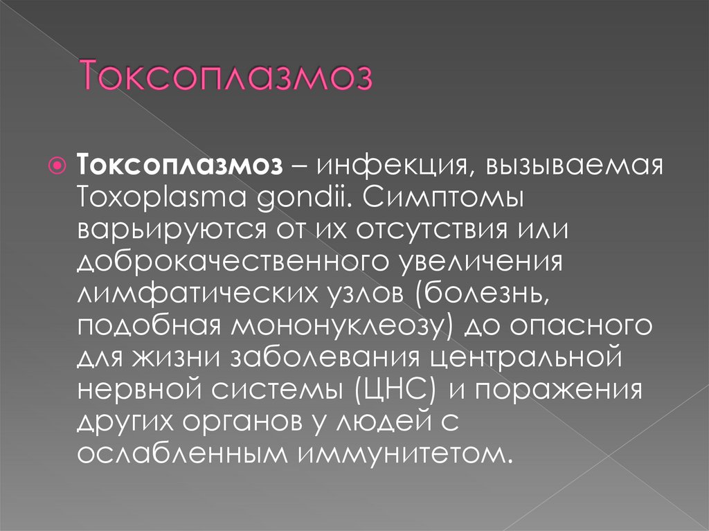 Токсоплазмоз – инфекция, вызываемаяToxoplasma gondii. Симптомы