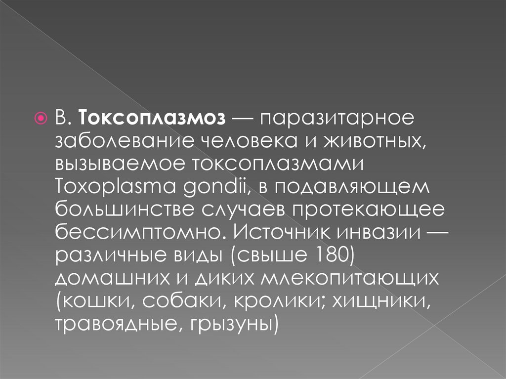 B. Токсоплазмоз — паразитарноезаболевание человека и животных,